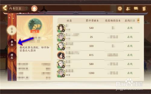进入雅社后,点击【内务信息】选项。