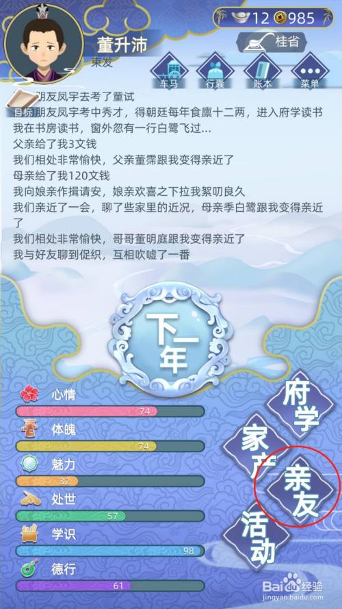 在“古代人生”本家儿界面中,点击下方的“亲朋”图标。