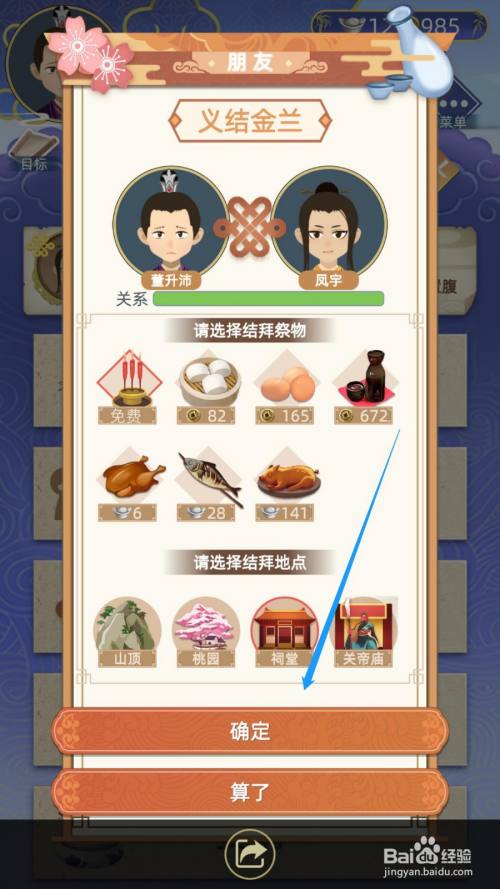 在“义结金兰”对话框中,选择结拜祭物与地址,点击“确定”按钮。