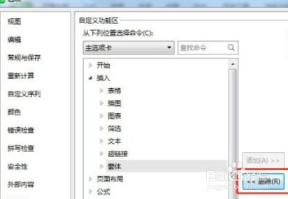 4、在右边的自界说功能区里面选中【插入】里面的【窗体】,然后点击【删除】。