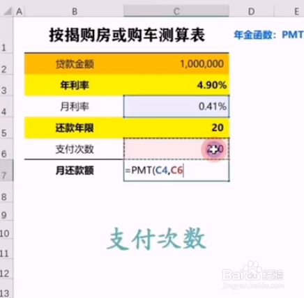 1、首先将房贷的贷条目金额、年利率、月利率、还条目年限、支付次数列在excel中,然后在需要计较出月还条目额的处所输入“=PMT”函数。