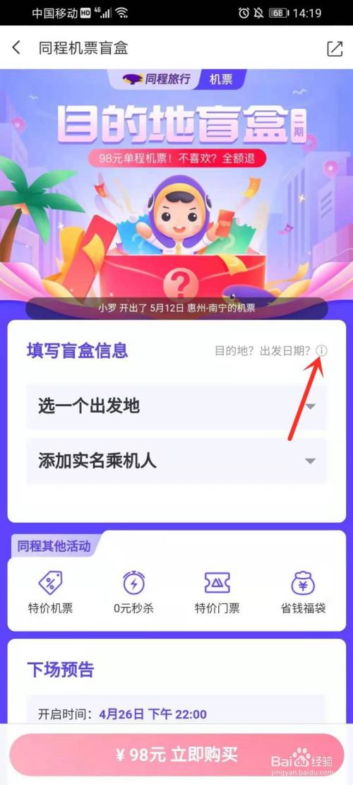 点击”填写盲盒信息“右侧的【¡】,打开机票盲盒活动法则。
