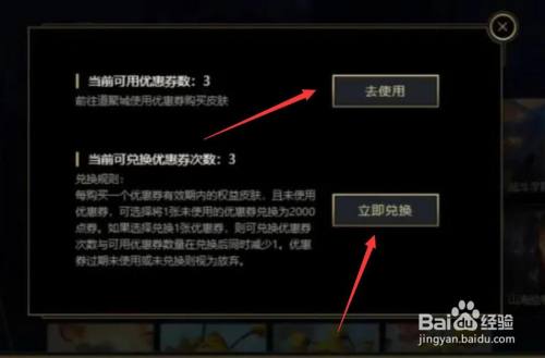 在优惠券详情页点击【去利用】可以用于采办皮肤时抵扣现金,只能采办20元以上的,点击【当即兑换】可以将优惠券兑换当作点券。