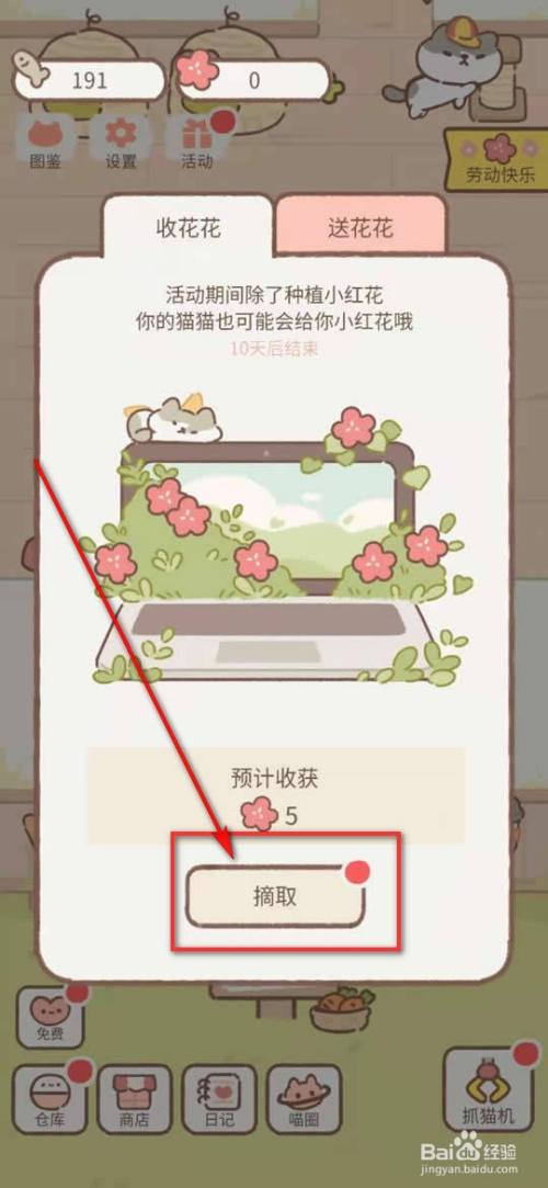 点击“收花花”下的“摘取”获得花朵。