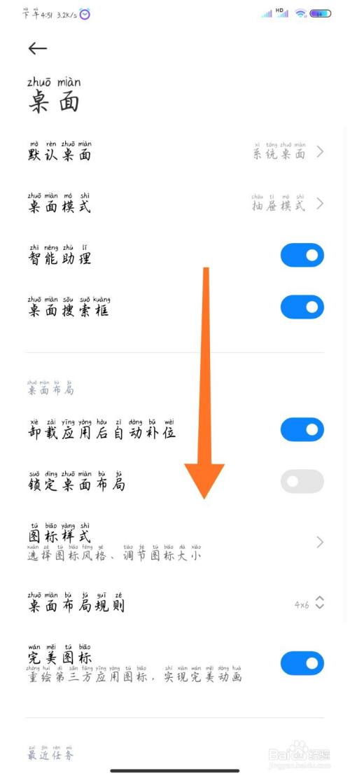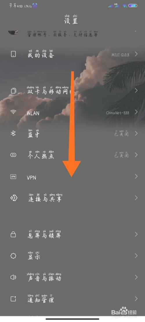 在设置里标的目的下滑动。