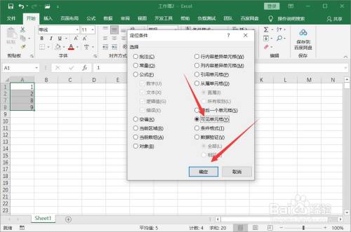 从头选择剩下的四个单位格,Ctrl+G打开定位窗口,在定位前提中选择【可见单位格】,点击【确定】。