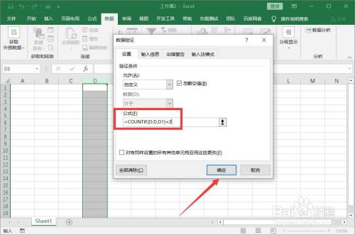 在公式栏中输入=COUNTIF(D:D,D1)<2,代表数据反复个数必需小于2,D暗示D列,点击【确定】。