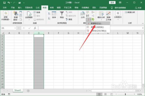 打开excel文件,选择某一列,例如D列,点击【数据】-【数据验证】。