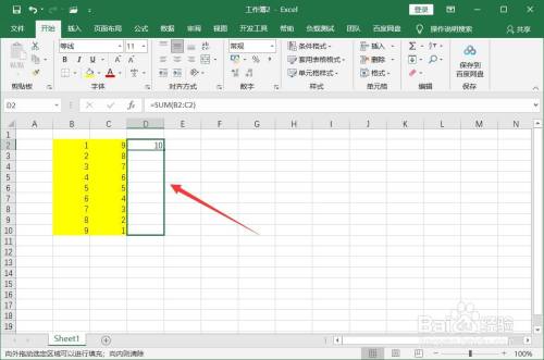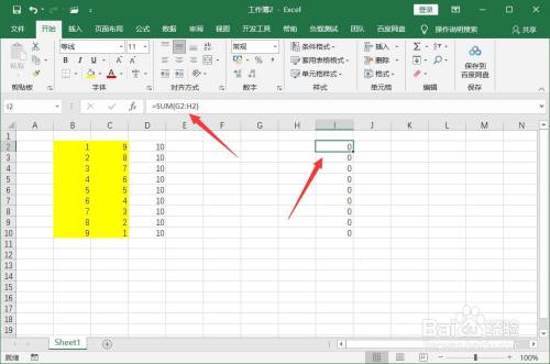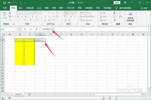 在excel中输入两列数据,在第三列第一个单位格中输入公式,以SUM乞降为例。