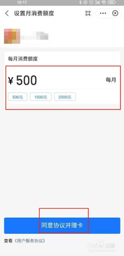 5、设定消费上限,点击赞成和谈并赠卡即可。