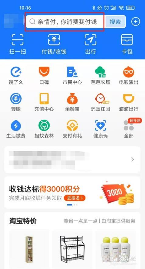 1、打开支付宝app,点在搜索框。