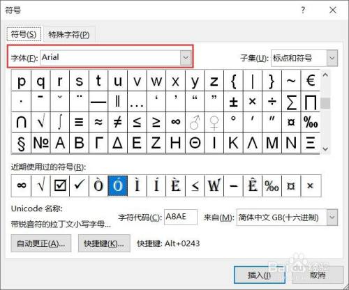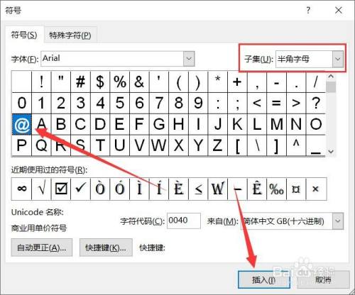 选择字体为Arial,子集设置为【半角符号】,选择@,点击【插入】即可。