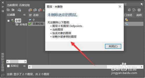 选择图层,右键鼠标点击【删除图层】,在弹出的窗口中显示不克不及删除的原因。