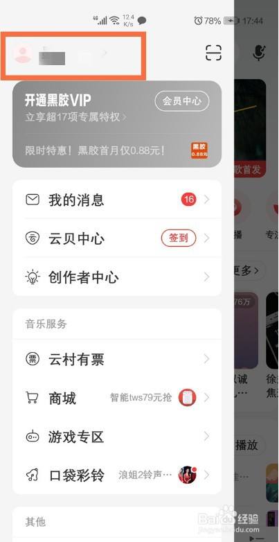 1、点击网易云音乐首页左上角三横,点击小我头像进入小我本家儿页。