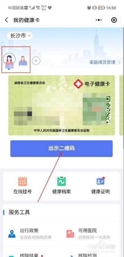 4、需要哪个健康码就点击哪个电子健康卡>点击下面的出示二维码即可。