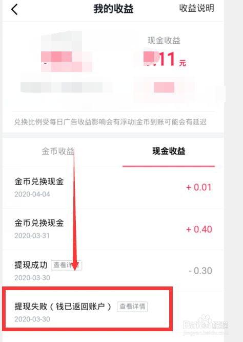 第三:点击【现金收益】选项查看【提现掉败】点击【查看详情】。