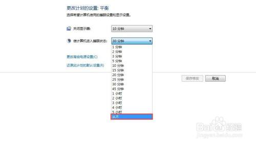 在新窗口中的使计较机进入睡眠状况的下拉中选择从不;