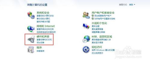 在节制面板中找到硬件和声音,点击打开;