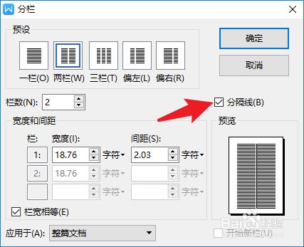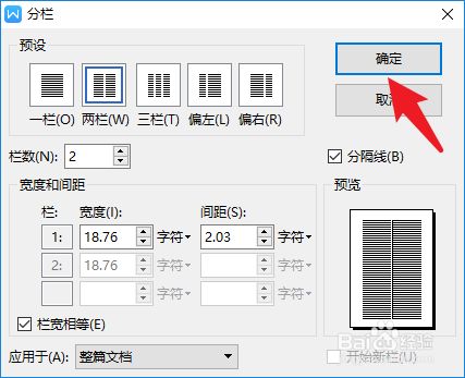 4、在【预设】里面选择分栏数,本文以两栏举例。