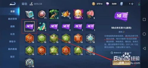 再在背包中找到适才打开的50点券优惠卡,点击利用。