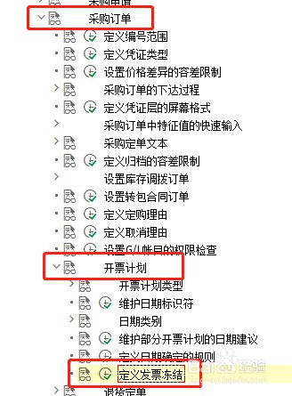 点击'物料办理',睁开子项,选择'采购' —>'采购订单' —>'开票打算' —>'界说发票冻结' ,点击执行