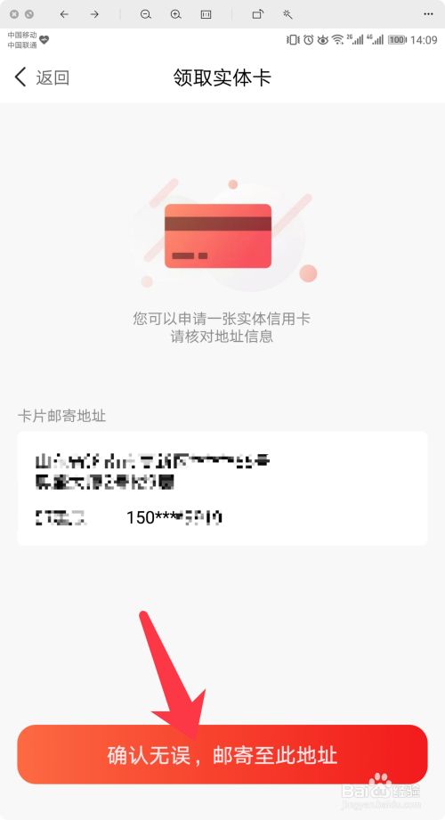 在领取实体卡中,确认【卡片邮寄地址】后,点击【确认无误,邮寄至此地址】按钮。