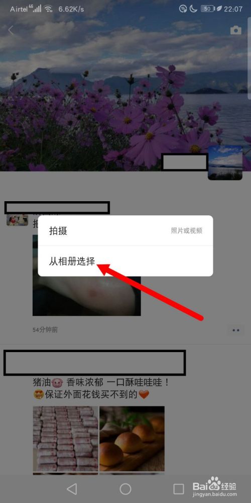 在朋友圈本家儿页,点击【拍摄】→【从相册选择】;