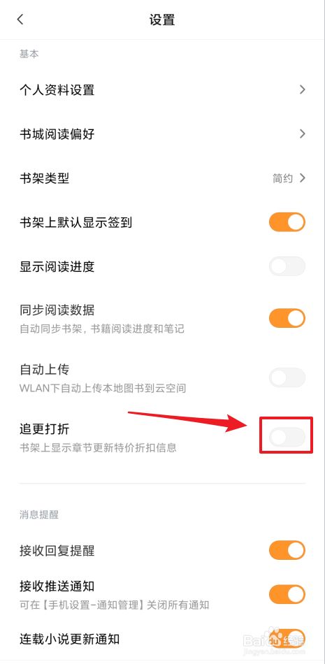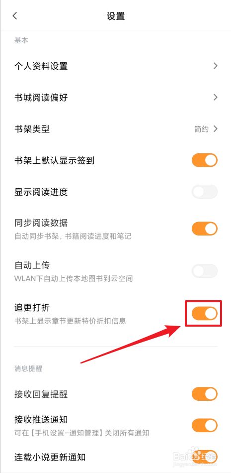 在“设置”界面,把“追更打折”右侧处于封闭状况开关打开。见下图