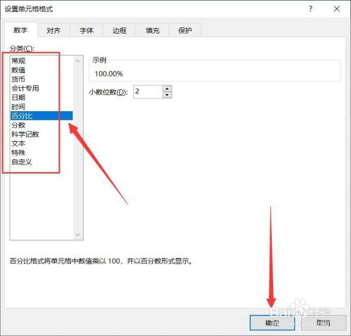 选择数字选项卡,在分类中选择分歧的数据类型,例如百分比,点击【确定】,返回表格即可看到数据类型更改当作功。