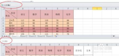 6、如图所示,我们可以让两个窗口显示在一路,这样更便利查看两个工作簿的信息。