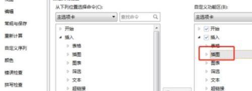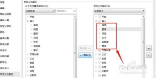 4、在右边的自界说功能区里面选中【插入】里面的【插图】,然后点击【删除】