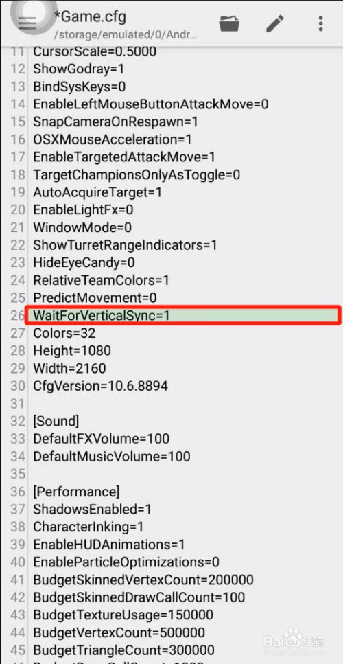 找到WaitForVerticalSync行,将数字0改为1即可。