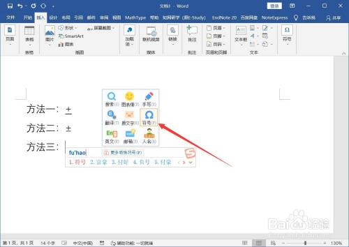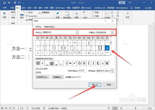 选择【通俗文本】-【标点和符号】,选择正负号,点击【插入】即可。