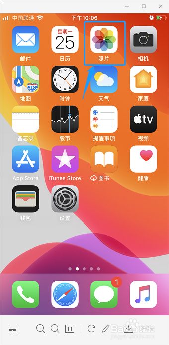 苹果手机比来删除的照片在哪里查找,首先,点击iPhone桌面的照片功能,并进入。