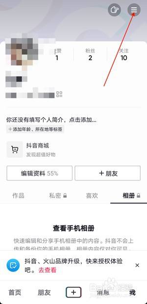 1、打开抖音>我,点击右上角按钮。