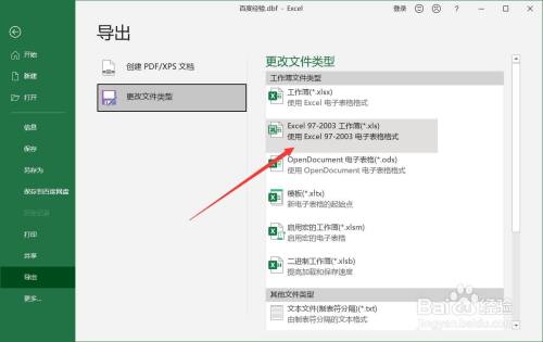 选择呢【导出】-【更改文件类型】,选择xls文件类型。