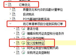 点击'物料办理',睁开子项,选择'采购' —>'订单优化' —>'将订单清单项目分组到采购订单' —>'界说节制特征' ,点击执行