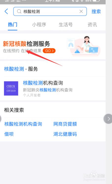 第二:在搜刮成果中点击【新冠核酸检测办事】链接。