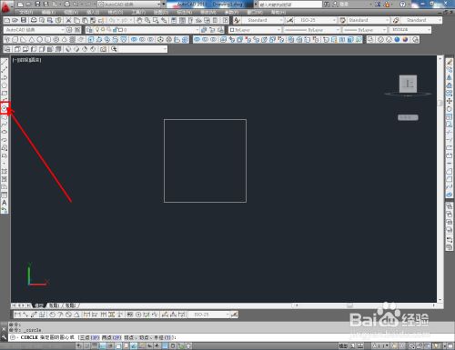 点击视图东西栏中的【前视】切换到前视图,点击【矩形东西】按图示绘制出一个正方形图案。点击【圆东西】,在正方形中绘制一个圆形图案;