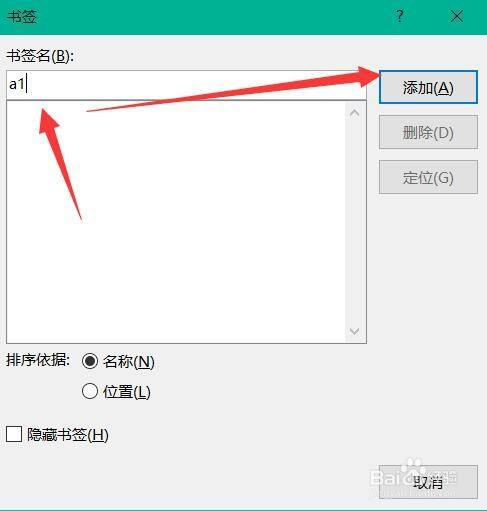 输入书签名,书签名称需要以字母开首。然后点击添加。