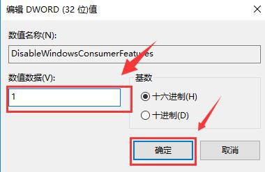 双击打开“DisableWindowsConsumerFeatures”,输入“数值数据”为“1”,然后点击“确定”保留;
