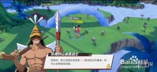 我们从船埠这个位置往中间走去,在这里会有一个NPC“乐不雅的山迪亚兵士”,而在它的前面会有一个摸索区域。摸索可以获取特别物品,这在后面会利用到。