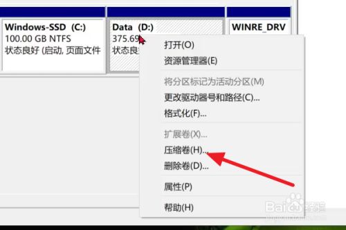 选择您要分区的磁盘,然后点击鼠标右键,选择压缩卷。