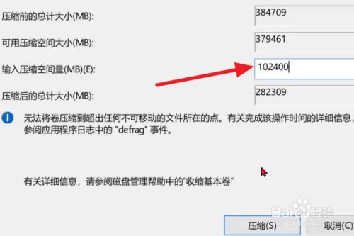 输入压缩空间量,也就是新盘的大小,点击压缩。例如我下面输入102400,因为单元MB,所以102400MB就是100G。