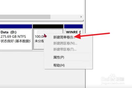 鼠标移动到新分出来的磁盘上面,点击鼠标右键,选择新建简单卷。