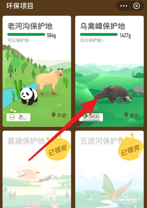 在环保项目界面,点击“乌禽嶂庇护地”。