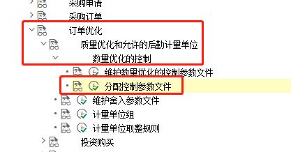 点击'物料办理',睁开子项,选择'采购' —>'订单优化' —>'质量优化和许可的后勤计量单元' —>'数目优化的节制' —>'分派节制参数文件' ,点击执行