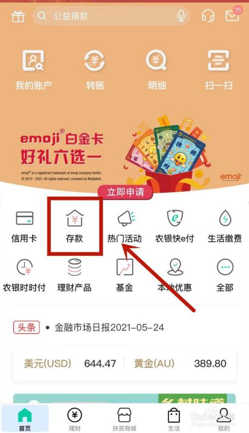 打开中国农业银行,点击首页的存条目。