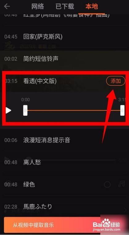 5、在当地中,选摘要添加的音乐,点击一下音乐,然后点击添加选项。如图所示