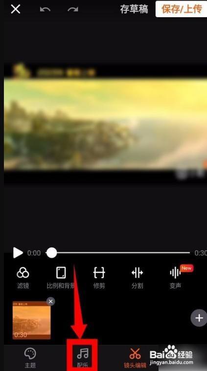 3、添加视频后,在视频编纂界面,点击底部的配乐选项。如图所示